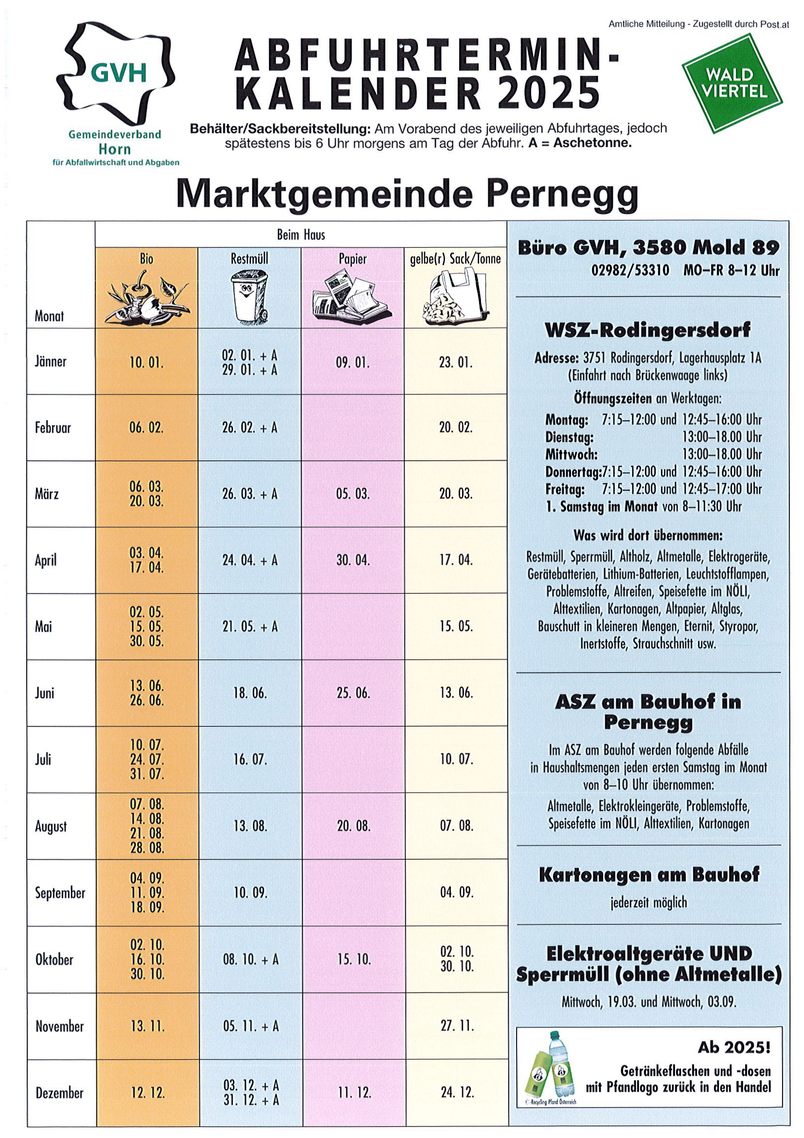 Restmüll, Sperrmüll, Altholz, Altmetalle, Elektrogeräte, Gerätebatterien, Lithium-Batterien, Leuchtstofflampen, Problemstoffe, Altreifen, Speisefette im NÖLI, Alttextilien, Kartonagen, Altpapier, Altglas, Bauschutt in kleineren Mengen, Eternit, Styropor, Inertstoffe, Strauchschnitt usw.