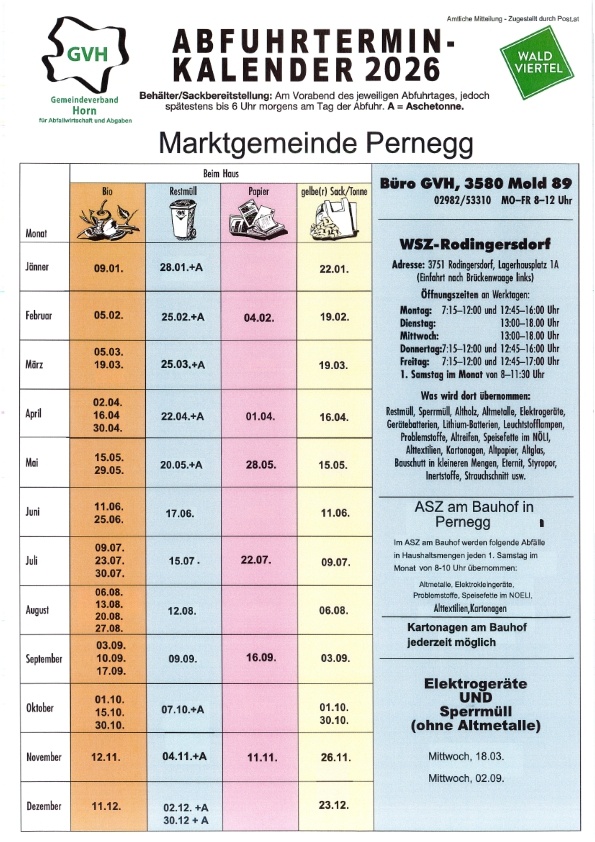 Restmüll, Sperrmüll, Altholz, Altmetalle, Elektrogeräte, Gerätebatterien, Lithium-Batterien, Leuchtstofflampen, Problemstoffe, Altreifen, Speisefette im NÖLI, Alttextilien, Kartonagen, Altpapier, Altglas, Bauschutt in kleineren Mengen, Eternit, Styropor, Inertstoffe, Strauchschnitt usw.